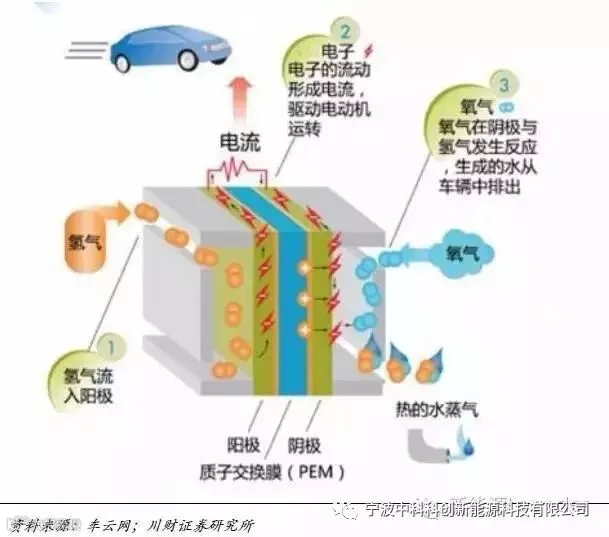 氢能燃料电池是通过氢气与空气中的氧气进行非燃烧的氧化还原反应,通过催化剂实现电子与离子的分离,进而产生电流,推动汽车电机的运转。质子交换膜燃料电池是最常见的燃料电池,因此氢离子可直接穿过质子交换膜到达阴极,而电子只能通过外电路才能到达阴极。当电子通过外电路流向阴极时就产生了直流电。