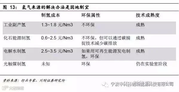 氢气来源要因地制宜,制氢方法成熟,分为工业副产氢、化石能源转化和电解水制氢,每种技术的制氢成本和环保属性不一样,选择哪种技术要考虑使用地区的实际情况,比如中国长三角地区,工业发达,副产氢气供应充足,成本也低。