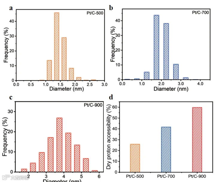图2. Pt/C-500、Pt/C-700、Pt/C-900的Pt颗粒尺寸与干质子可及率。(Sci. China Mater. 2024, 67, 1851-1857)