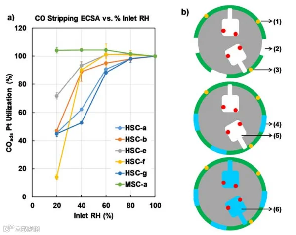 图1. a) 催化剂在不同湿度下测得的Pt利用率。b) 不同湿度条件下的催化剂示意图。从上至下,湿度升高。其中,黄色代表孔道外的Pt位点,红色代表孔道内的Pt位点,绿色代表离聚物,蓝色代表液态H2O。(J. Electrochem. Soc. 2020, 167 (6), 064515)