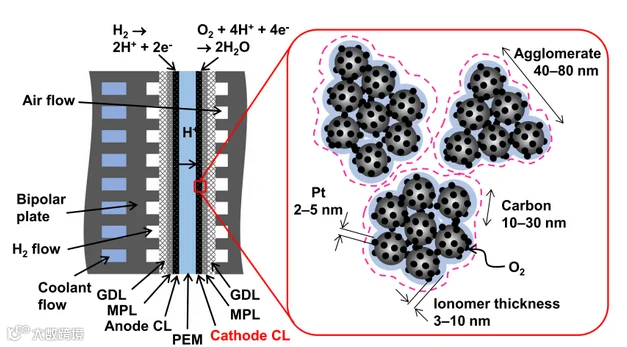 (3)研发新型高渗透性离子导体。例如,丰田中央研究所开发的高氧气透过性离聚物(HOPI)显著提升了离聚物与Pt界面处的氧气渗透率,有效减轻了催化剂中毒,从而增强了阴极催化层的氧气传输效率和氧还原反应的质量活性(Nat Commun 2021,12, 4956)。