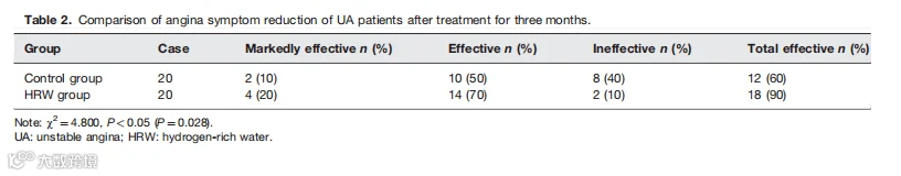 研究入组40名患有不稳定型心绞痛的住院受试者,要求其连续三个月摄入1000-1200mL/d的富氢水或等量的安慰剂纯水。