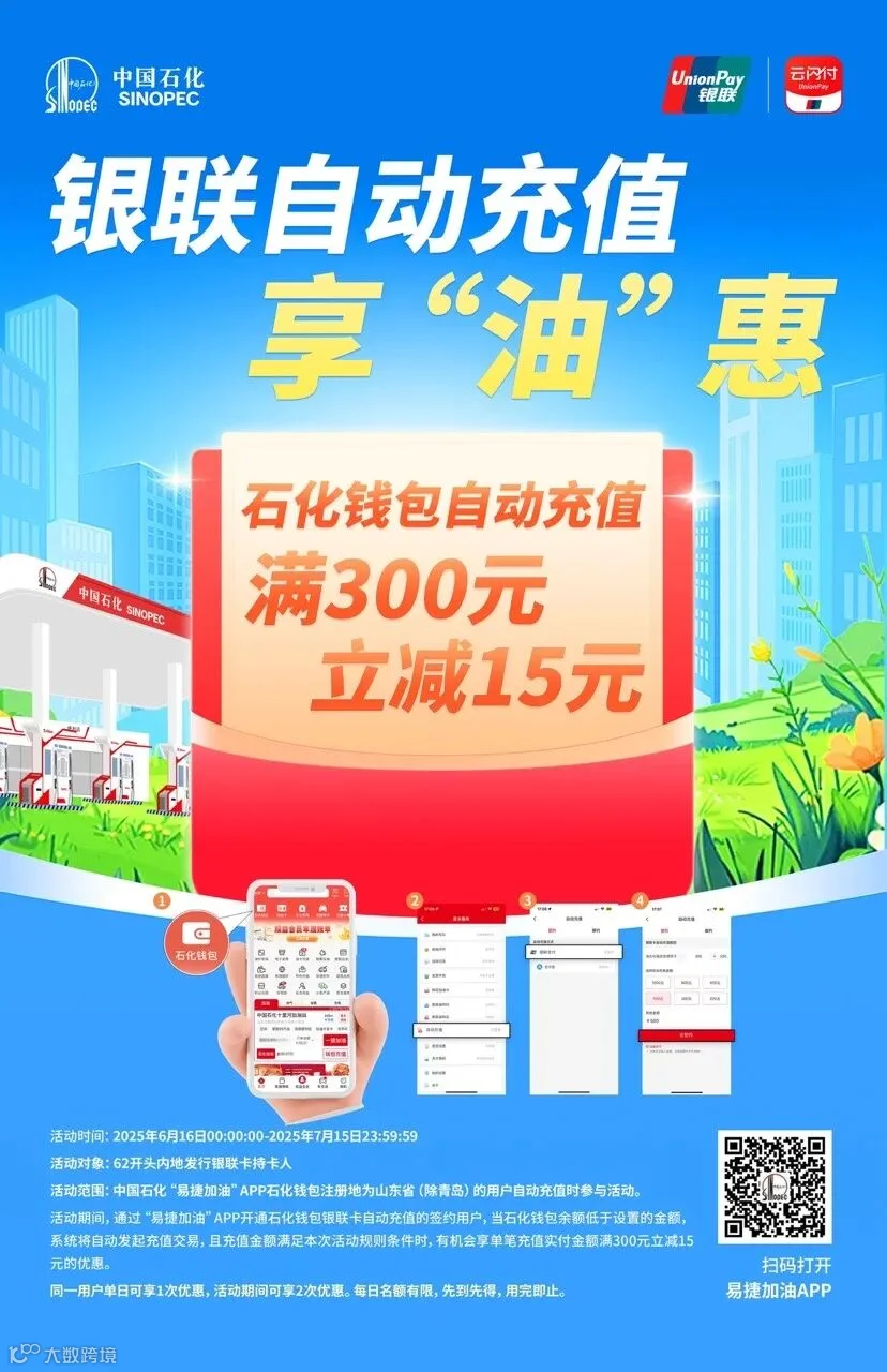 活动期间,通过“易捷加油”APP开通石化钱包银联卡自动充值的签约用户,当石化钱包余额低于设置的金额,系统将自动发起充值交易,且充值金额满足本次活动规则条件时,有机会享单笔充值实付金额满300元立减15元的优惠。