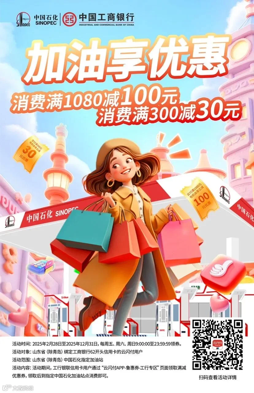 活动内容:活动期间,工行银联信用卡用户通过“云闪付APP-鲁惠券工行专区”页面领取满减优惠券,领取后到指定中国石化加油站点消费即可。