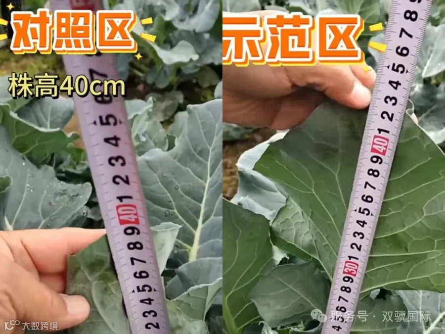 只用过一次鲍利液的西蓝花示范区,在二十天后随机收取20组数据,取平均值计算,发现在株高、叶宽和叶长上,示范组的植株长势都是优于对照组的。