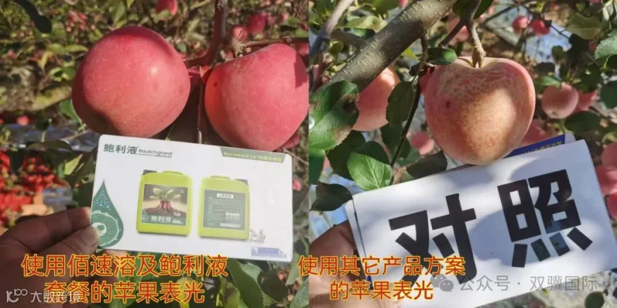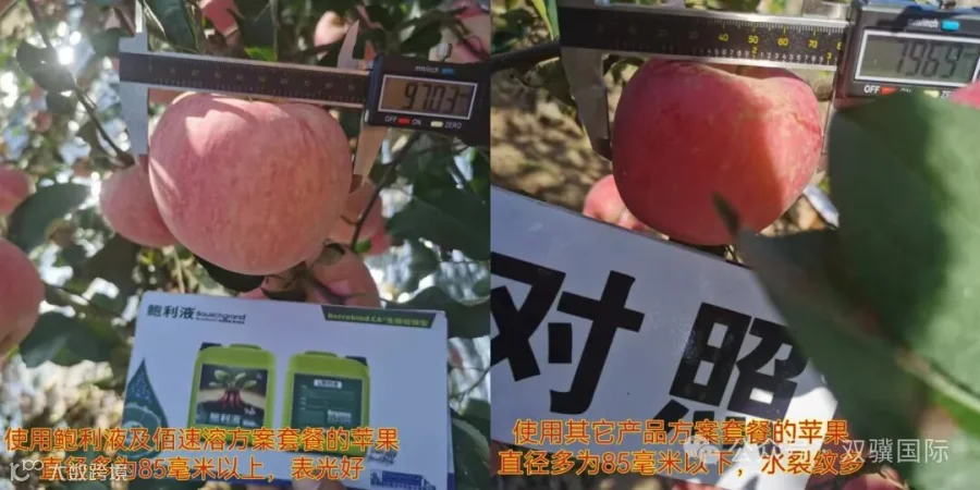 2024年10月12日,我们来到山东烟台市牟平区龙泉镇曲大哥的苹果种植地现场采访了他,他说今年受温度及雨水影响,苹果个头不均匀,水裂纹及病害多,曲大哥因在8月份的时候使用鲍利液产品一遍,苹果长势效果很好,整体个头均匀,85毫米以上个头的多,上色均匀,表光好。相对比其它田块个头整体偏小,个头不均匀,水裂纹,苦痘病和斑点病发病多。
