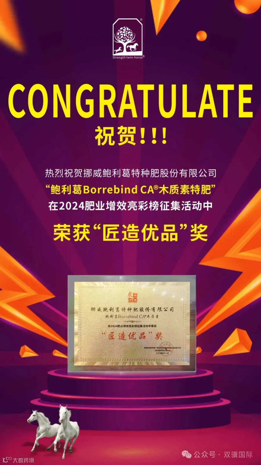 热烈祝贺:“鲍利葛Borrebind CA®木质素特肥”在2024肥业增效亮彩榜征集活动中荣获“匠造优品”奖!