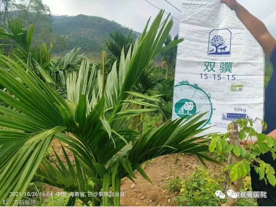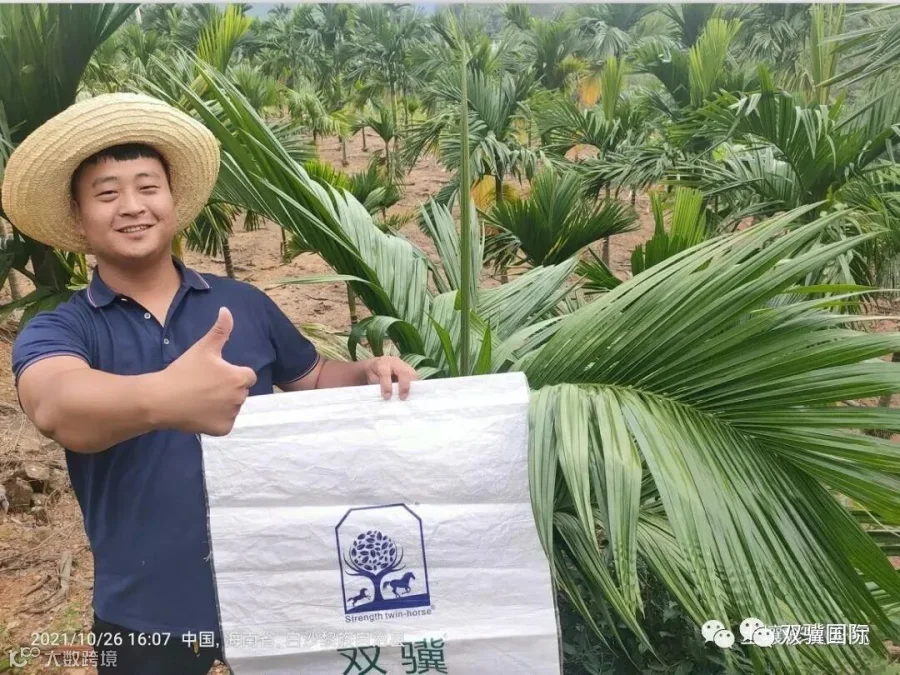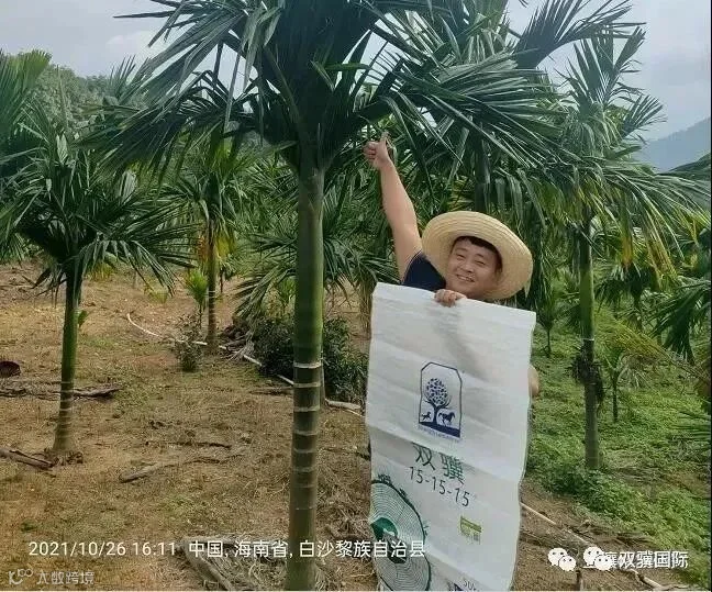 总结:老哥种植大大小小5000多株槟榔,这两年一直使用挪威双骥,槟榔苗长的快,茎秆特别的粗壮,抽出的芯叶也非常的漂亮,结出的槟榔个头均匀,油绿绿的,非常认可这个特肥。