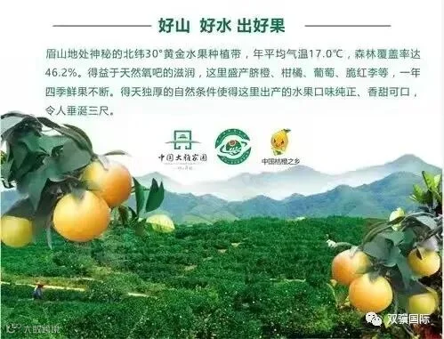 眉山市位于四川盆地成都平原西南部,地处神秘的北纬三十度黄金水果种植带,属亚热带季风湿润气候,这里盛产脐橙、柑橘、葡萄、脆红李等,一年四季鲜果不断,得天独厚的自然条件使得这里出产的水果口味纯正、香甜可口,令人垂涎三尺。
