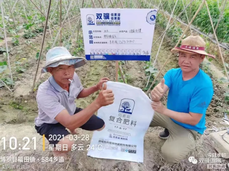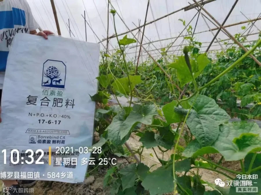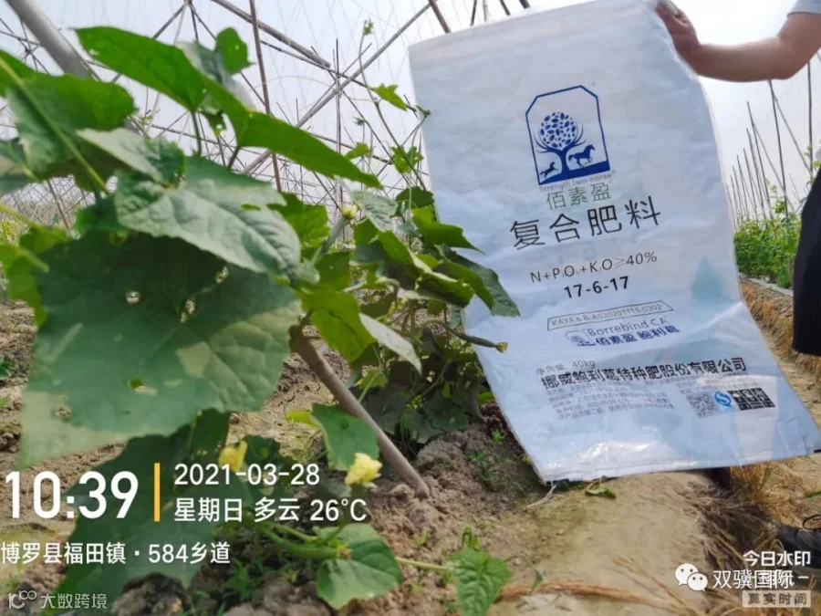 技术员:今天是3月28号,我们来到了愽罗县横溪头,这位老哥的丝瓜地,我们是3月 20号来做我手上这一款双骥佰素盈17-6-17这个配比的示范,我们来回访一下,我身后这个老哥对我手上这款肥是什么样的评价。