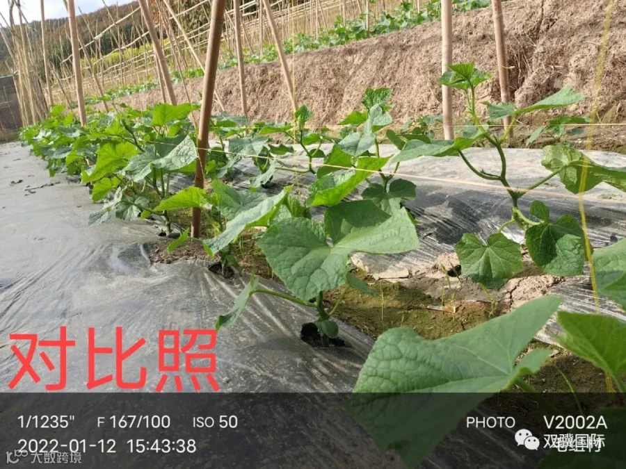 通过进行实物对比,我们可以直观地看到,在经过使用这两款肥料的青瓜根茎粗壮,叶片有成年人的两个手掌那么大,而且颜色也非常绿,青瓜苗整体都长得很均匀,确实是让种植户看了心里喜滋滋的效果!