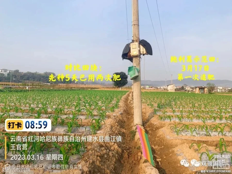3月16日建立红河绿丰方案示范田块,4月17日在建水曲江王官营回访甜脆玉米种植户白勇。在其第一次浇肥时旁边田块的甜脆玉米已在浇第二道肥,长势、植株高度、叶片大小完全都不一样。