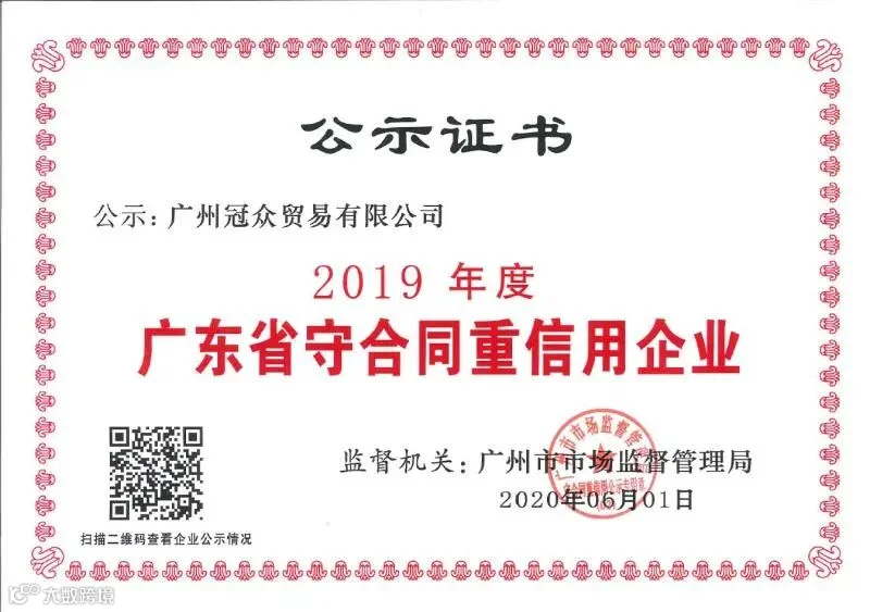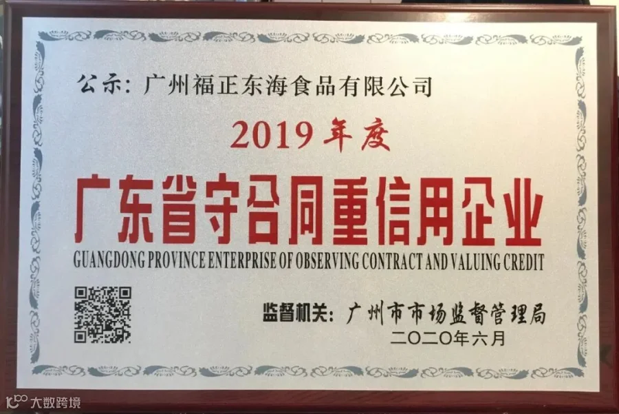 特大喜讯——冠众集团旗下的广州冠众贸易有限公司和广州福正东海食品有限公司荣获2019年度广东省“守合同重信用”荣誉称号!