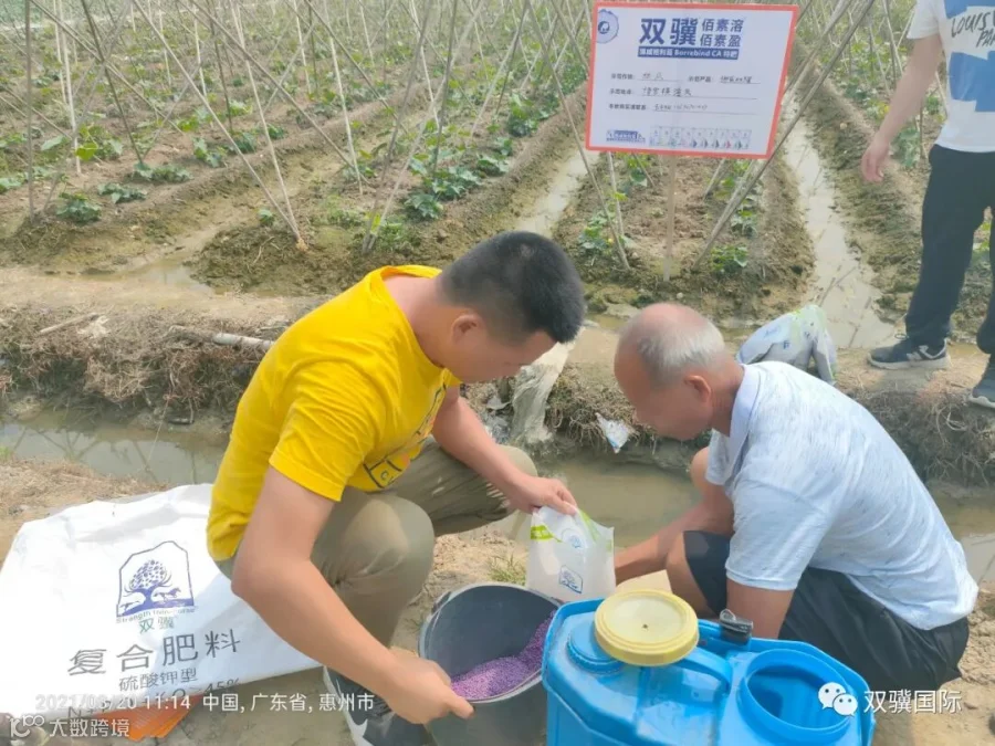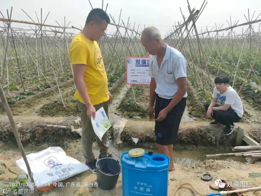 技术员对这位大哥说:“老哥,您好!我是挪威双骥-佰素溶特种肥的技术员,看到您这里种植的丝瓜刚出苗,想借用您的宝地,用这款特肥进行试验,比较一下施用后的长势、开花结果情况,您看行吗?”