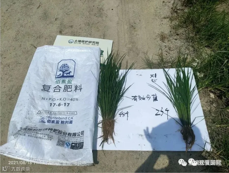 我们从施用不一样肥的两边田里各拔出一株长得比较好的水稻,进行对比。从视频中可以明显看到施用挪威鲍利葛的根系很粗壮,有效分蘖48个,而施用其他肥料的另一株有效分蘖23个,所以这个肥的效果超乎想象。