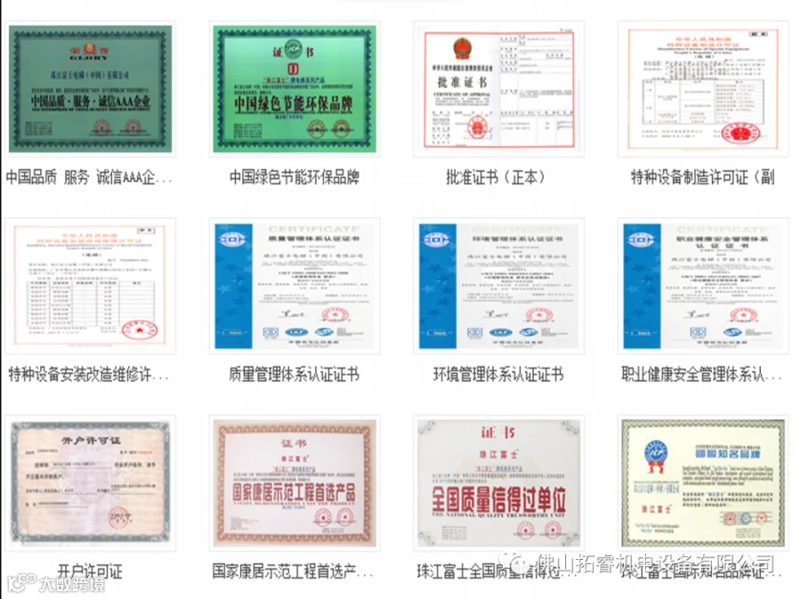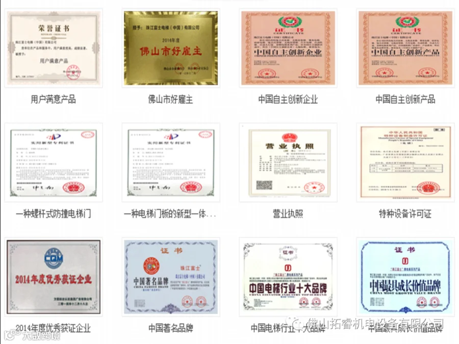 珠江富士电梯是持有国家质量技术监督检验检疫总局颁发的A类电梯整梯制造、电梯安装、改造、维修许可证的专业电梯制造企业。并获得国际ISO9001质量管理体系、IS014001环境管理体系、OHSAS18001职业健康安全管理体系认证、中国建设银行佛山分行VIP客户、全国质量信得过单位等企业荣誉。