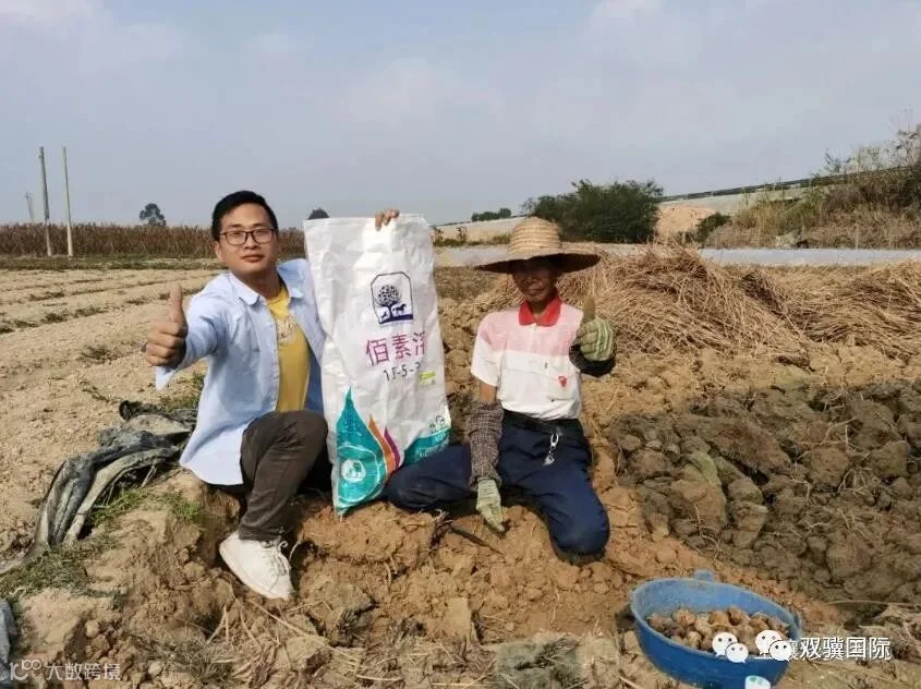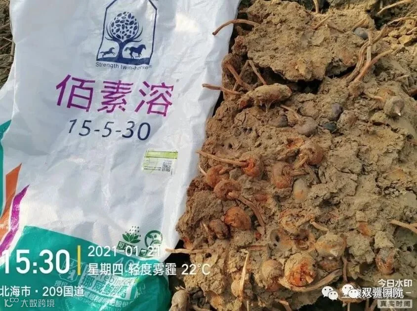 王大哥说:从上午开始到现在还没有挖到一分亩,已经挖出了11袋马蹄,每一袋有110斤,按照这样估算这一亩地能产马蹄10000斤以上。他说:明年种马蹄全程用这款有两匹马的挪威肥。