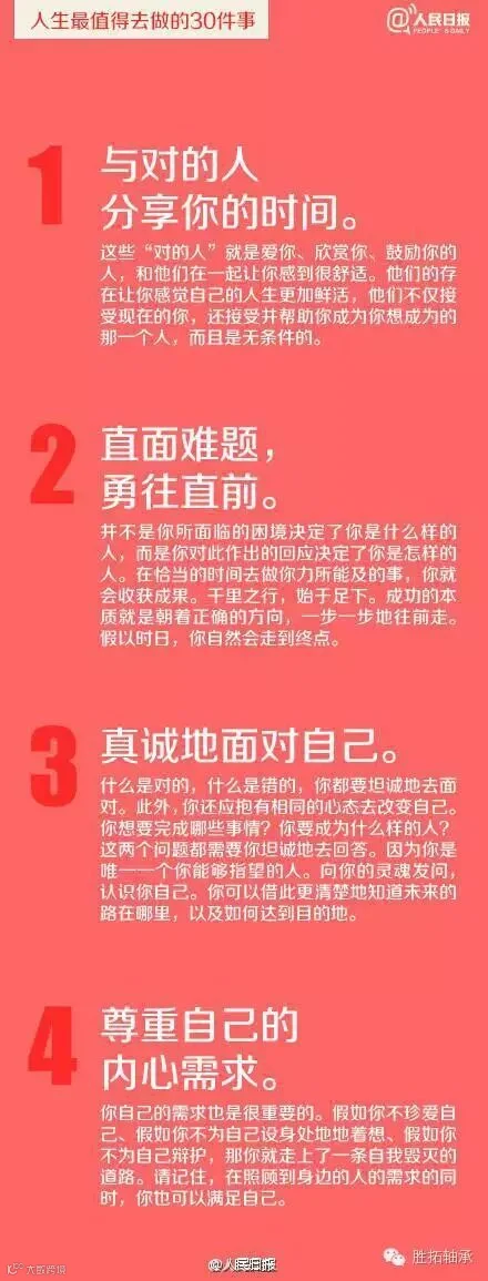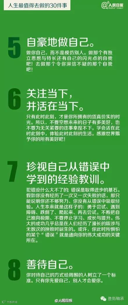①真诚面对自己,你爱自己,别人才会爱你;②不怕失败,青春有无数机会重来;③给梦想一次破茧而出的机会;④保持开放不封闭的心态;⑤不断超越过去的自己,人生的赛跑,你的终极对手只有一人,那就是你自己。
