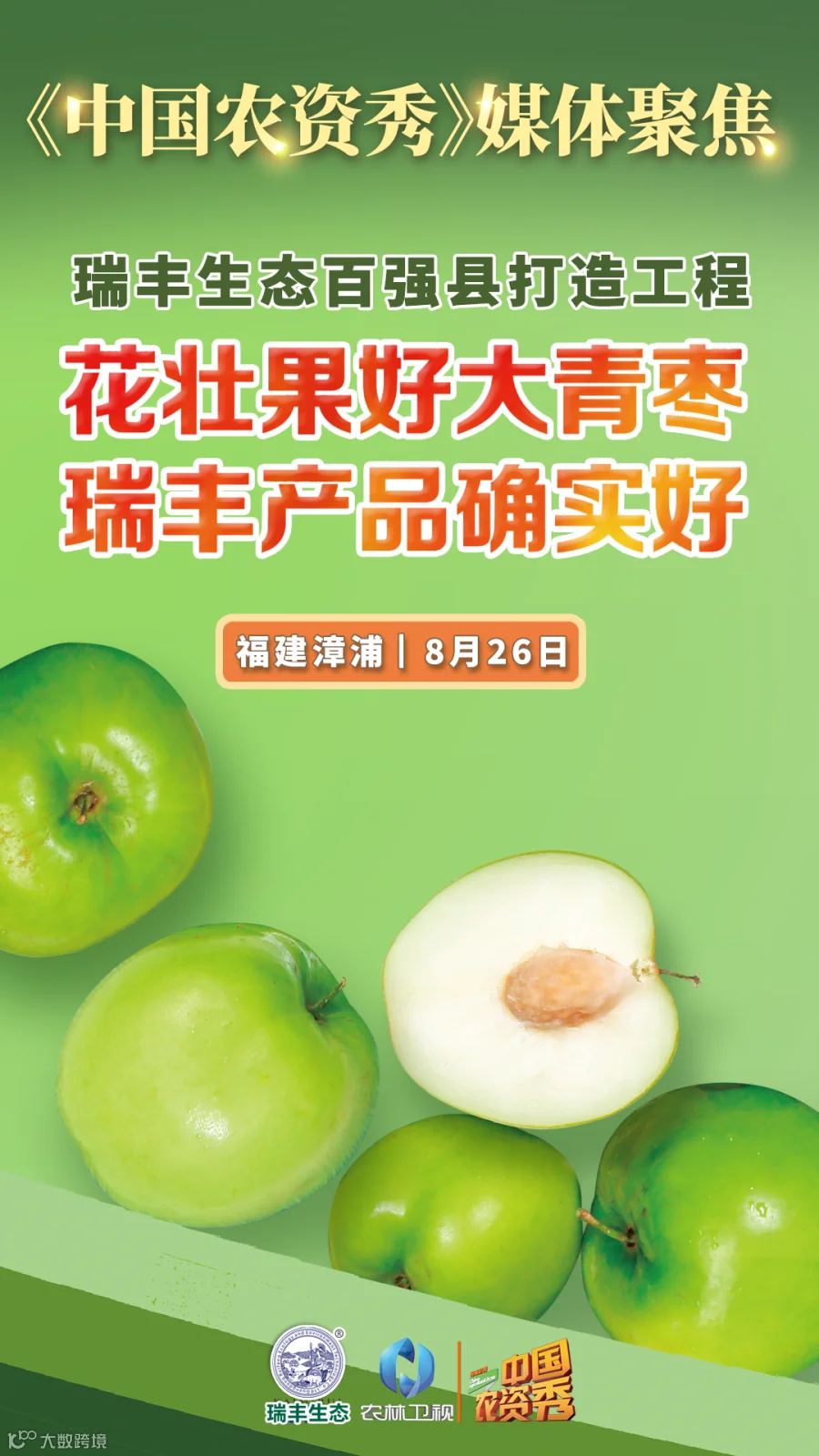 8月26日,农林卫视《中国农资秀》携手瑞丰生态共同举办的瑞丰生态百强县打造工程将走进福建漳浦县青枣种植区。