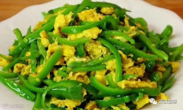 4、盛出鸡蛋再放油烧热,放入青椒炒到青椒稍软放入鸡蛋,调入盐、白糖、味精炒匀关火。