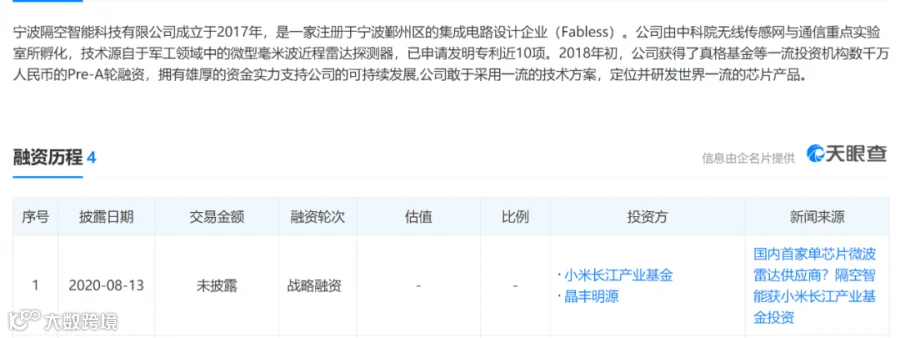 天眼查显示,近日, 湖北小米长江产业基金合伙企业(有限合伙)再投资了国内射频与微波的集成电路设计公司――宁波隔空智能科技有限公司,持股4%。