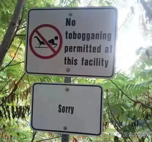 ▼11.这个警示牌写着:此地不可乘平底雪橇滑雪。但是下面又加了句:sorry.