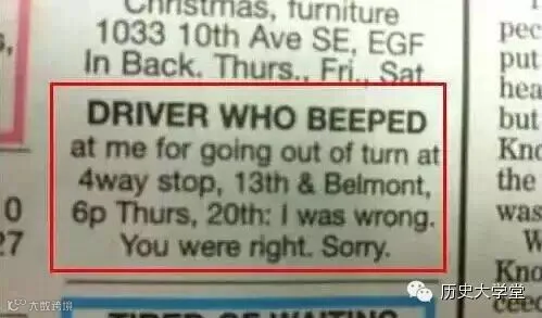 ▼6.这位司机大概是在路上行驶的时候超车了,后面的司机冲他按喇叭。事后司机登报道歉:“按喇叭的师傅,我错了,你是对的,对不起。”