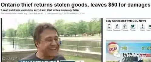 ▼7.这则cbc新闻报道的是:安大略一小偷将盗窃的物品归还原主,还留下50美元作为赔偿。(完全不顾贼的操守,只为做个好人啊……)