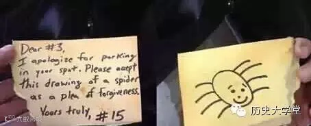 ▼4.这是一位占了别人停车位的人留下的道歉条:亲爱的3号,很抱歉占了你的停车位,但是为了请求你的原谅,请收下我画的这只蜘蛛。你诚挚的15号。(这么卖萌真是……)