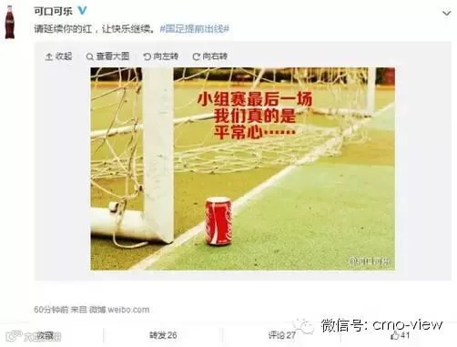 短小精悍,充满力量,一语双关,红色的可乐罐与国足红白相间的队服,相映成趣,再加上“小组赛最后一场,我们真的是平常心……”又带有祝福与期望。