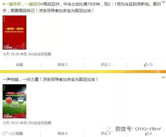 4.加多宝:#一罐传承,一罐坚持#再战亚洲,中乌之战比赛78分钟,现2:1领先乌兹别克斯坦。赢对手,更要赢回自己!凉茶领导者加多宝为国足加油!