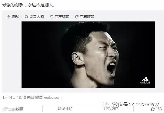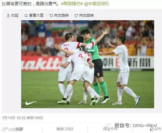 接盘侠nike无疑是本次国足出线的最大受益者,文案是一如既往的励志,并且还可以正大光明的和中国足球队互动。尽管耐克并没有刻意宣传,但“穿了耐克好像就能赢球”已经在微博上传了个遍。此时的它估计什么都不做也是存在感最强的品牌了。