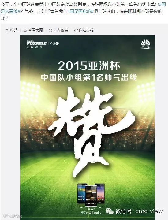 华为的文案祝贺意外比较浓,讨好球迷也未尝不是个营销方法。