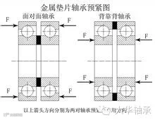 在有锥齿轮传动的轴上、切丝机磨刀砂轮轴的运转过程中都有由锥齿轮、磨刀砂轮传到传动轴的轴向力,为了有效地消除来自转动体两端的轴向力,推力轴承必须以面对面或背靠背地安装于转动体两端。由于轴承内圈与外圈存在一定的轴承间隙,为了提高传动轴的旋转精度和刚度,在安装推力轴承时应对其进行轴承的预紧。即在安装过程中对轴承给予一定的轴向作用力,使轴承内外圈产生相对位移,从而消除了游隙,并在套圈与滚动体接触处产生了弹性预变性,由此提高了轴的转动精度和刚度。预紧力可利用金属垫片或磨窄套圈等方法获得。如图:
