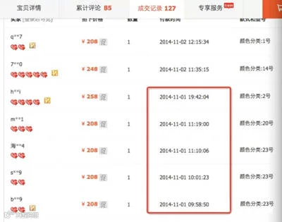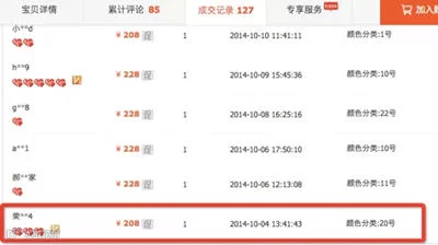 从图例中,我们可以看到,这款商品的描述、服务、物流指数都全线飘红,为4.9;评价也相当不错,共有85条带字评论,其中好评83,中评1,差评1,追评3;至于描述,自然和大部分淘宝商品一样,十分之好;成交记录显示,每天都有5-6单的成交量。 但事实上,这款商品是有很多刷单的,如何判断呢?先看上面第一张图片中的累计评论数量和交易成功数量,分别是85和81。 所谓交易成功数量,其实就是最近一个月内,商品确认收货人数;累计评论数量,就是商品最近三个月里所产生的带字评论。 再看这款商品的第一单成交记录,显示是在10月4日。