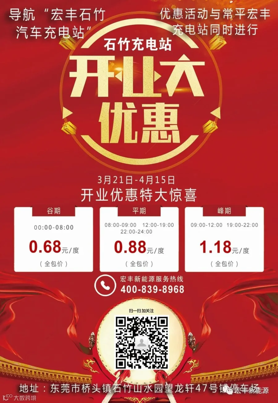 好消息!好消息!广东宏丰新能源科技有限公司桥头石竹山水园充电站快充桩上线,本站有120KW快充桩8台,可满足16台新能源电动汽车同时充电,新站开业酬宾,常平宏丰充电站与本站双站同庆活动进行中,欢迎新老客户前来体验。