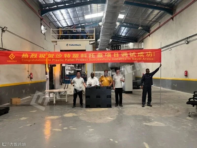 沙特模压塑料托盘生产线稳定运行后,每4 分钟成型 1 块托盘,单机小时产量15 块,24 小时可持续产出360 块高品质托盘,可快速满足本地市场供应。