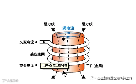 大电流流向被绕制成环状或其它形状的加热线圈(通常是用紫铜管制作)。由此在线圈内产生极性瞬间变化的强磁束,将金属等被加热物质放置在线圈内,磁束就会贯通整个被加热物质,在被加热物质内部与加热电流相反的方向产生很大的涡电流,由于被加热物质内的电阻产生焦耳热,使物质自身的温度迅速上升,这就是感应加热的原理。