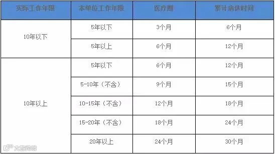重庆瀚沣律师事务所陈律师:根据《企业职工患病或非因工负伤医疗期规定》第三条的规定,企业职工因患病或非因工负伤,根据本人实际参加工作年限和在本单位工作年限,给予三个月到二十四个月的医疗期,详见下表: