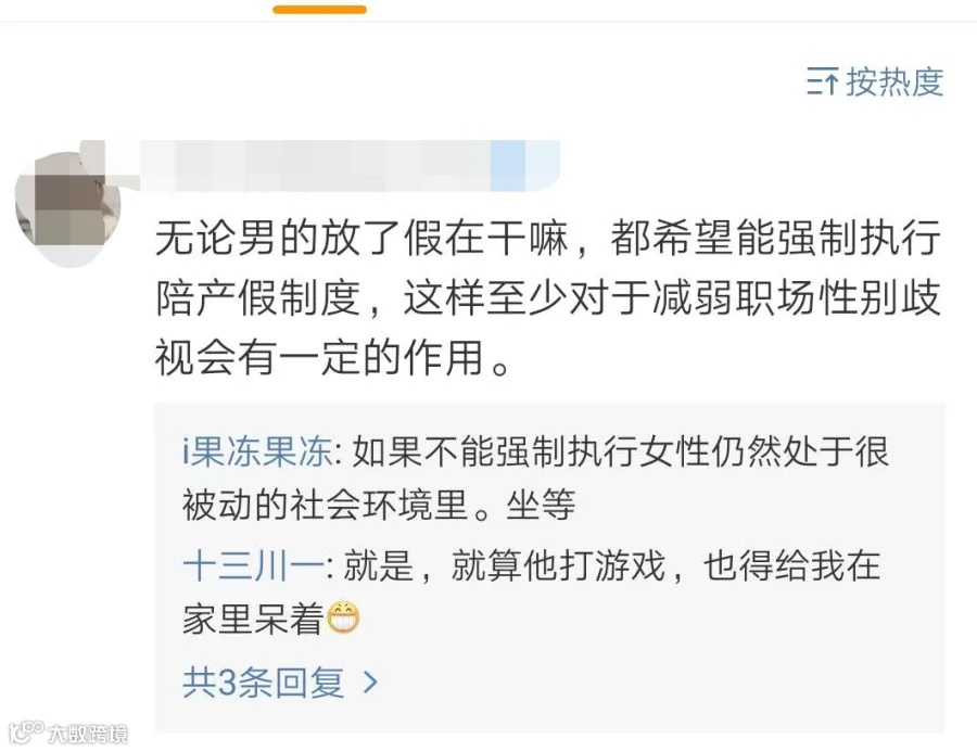 对此,不少网友表示,有更多时间陪妻儿渡过这个重要时期是很好的。也有部分表示反对,“更多的关照应该是取决于生活中每个时刻,而不是特定的长假。现在竞争压力大,需要保持竞争力。”