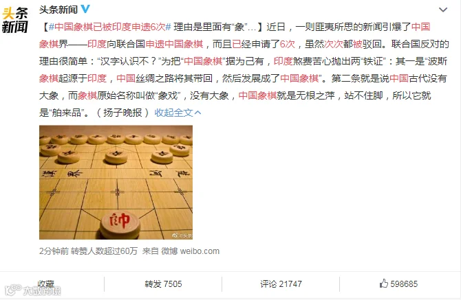 ——印度向联合国申遗中国象棋,而且已经申请了6次,虽然次次都被驳回。