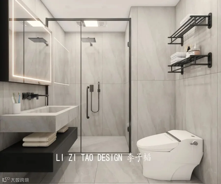 毕竟厕所是强功能性区域,对于材料防水性也有要求,一旦加入大多的配件和家具,除了空间会受到限制,后期更换/维修/废弃也是一笔费用。