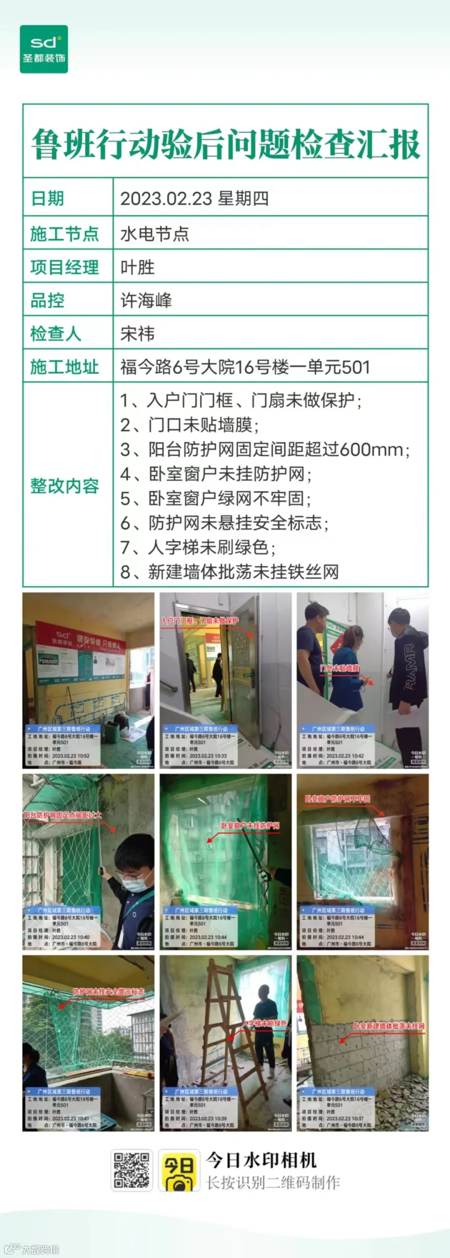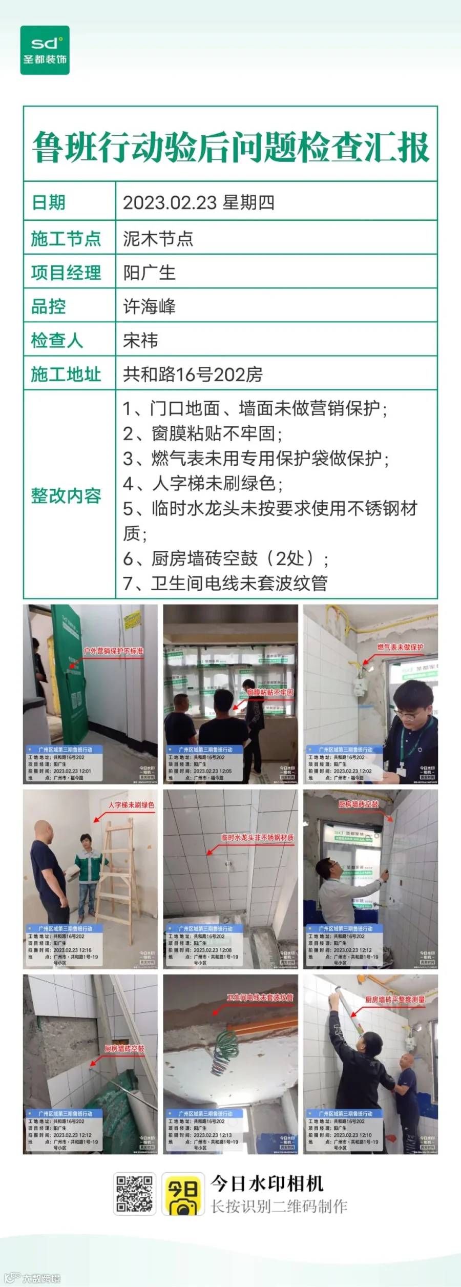 为进一步提升工程质量,让整个施工过程更加量化、透明化,圣都家装全面开启鲁班行动,由贝壳圣都广州大区城市总天助带队,联合品质部、工程部,以及天河店店总下到工地巡查,整改问题。