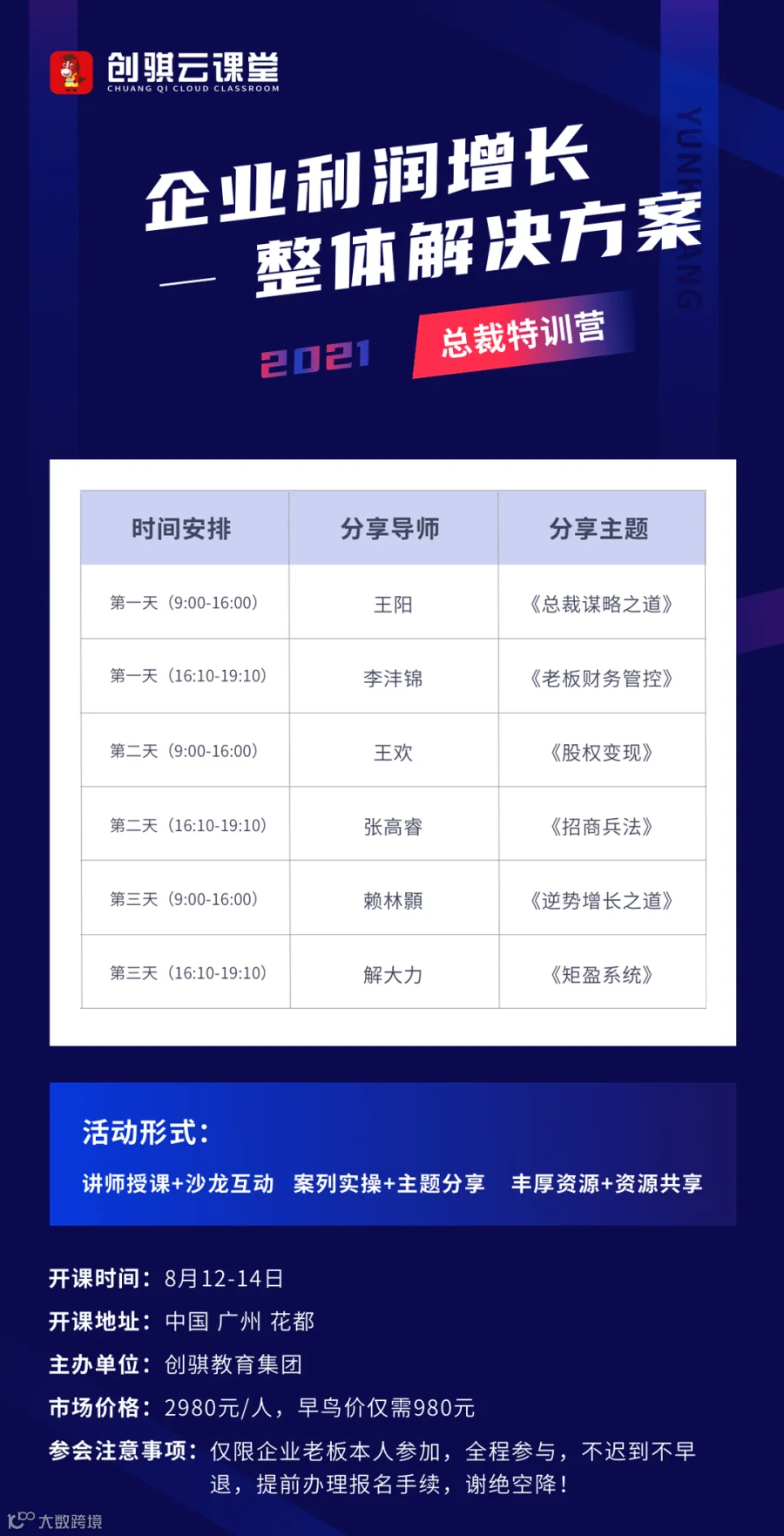 三天全维度实战内容分享,通过定制化的企业全案,将助力企业获得模式赋能、资本赋能、价值赋能、资源赋能!本总裁特训营仅限年产值2000万以上的企业老板本人及核心股东参加,席位有限,立刻报名参与!