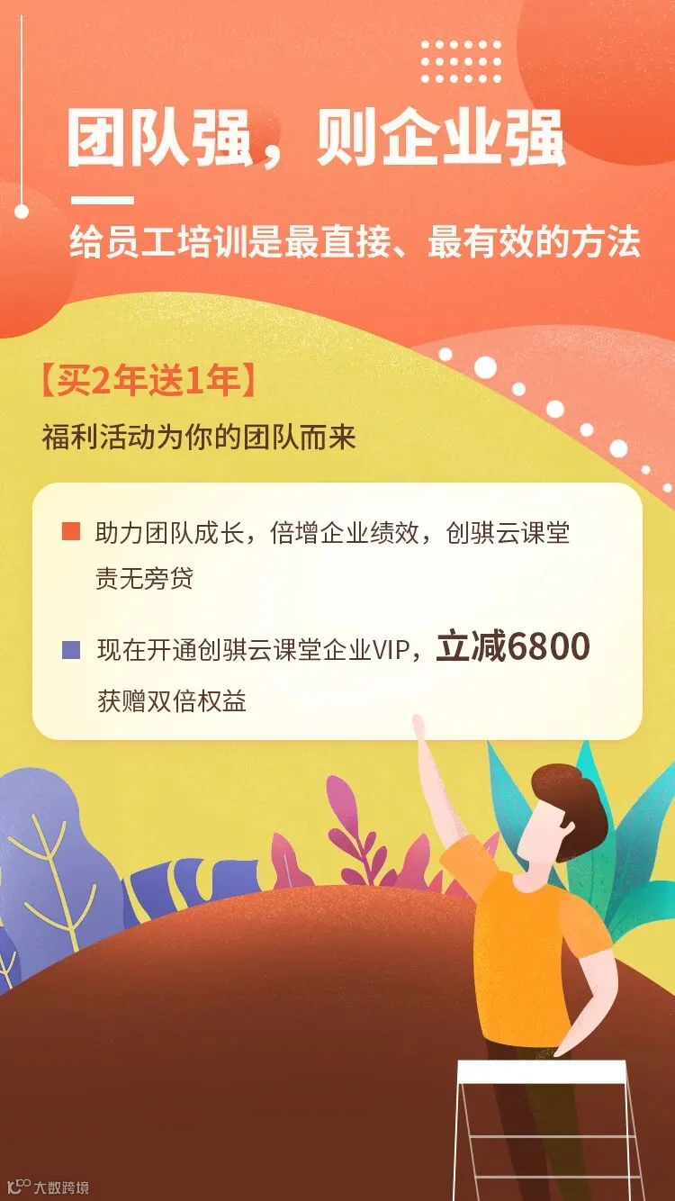 现在!马上开通企业VIP,买2年送1年会员,直接省下6800元!越早开通,团队越早受惠,更快速地掌握最新的产品知识,及时地更新知识体系,提升业务技能,为企业创造更大价值!