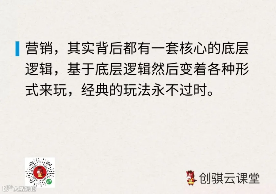 说到营销,其实背后都有一套核心的底层逻辑,基于底层逻辑然后变着各种形式来玩,经典的玩法永不过时,就看大家怎么玩得更新颖些,但前提是要搞懂营销的核心逻辑,才能延伸出更多新玩法。