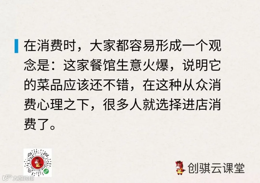 由于大家都聚集在入口处点餐,从外面往店内看,就会觉得这家餐馆的生意非常火爆,而在消费时,大家都容易形成一个观念是:这家餐馆生意火爆,说明它的菜品应该还不错,在这种从众消费心理之下,很多人就选择进店消费了。
