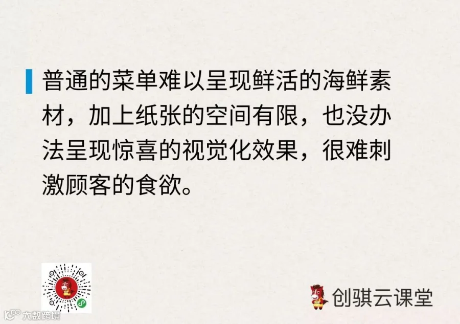 试想一下,如果顾客安安静静地坐在座位上,拿着菜单点餐,还会有这样的效果吗?毕竟菜单难以呈现这么鲜活的海鲜素材,加上纸张的空间有限,也没办法呈现惊喜的视觉化效果,也就很难刺激顾客的食欲。