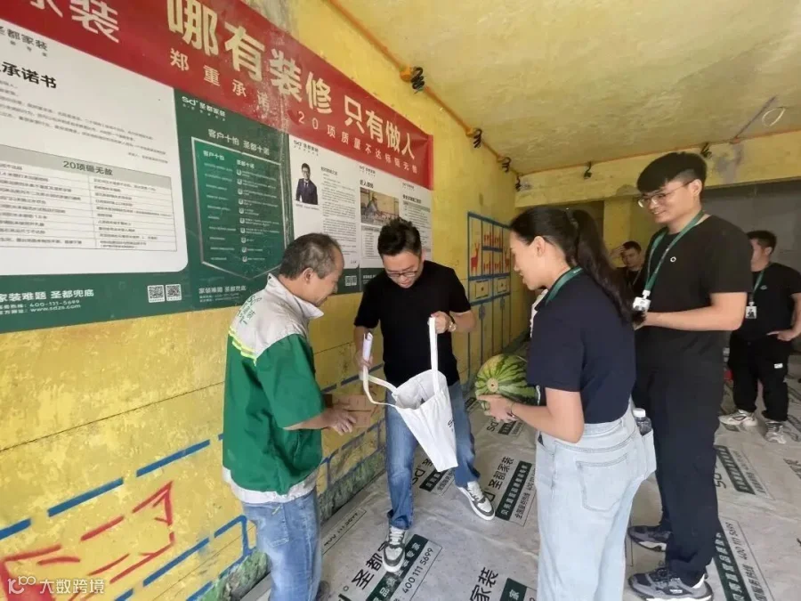 在巡检地最后,蒿总带领服务团队为现场辛勤建设的工人们送上清凉礼包(工艺手册、挂脖风扇、西瓜、手套和水),感谢他们炎热的工地中依然恪尽职守,为客户实现美好家愿而作出的贡献。