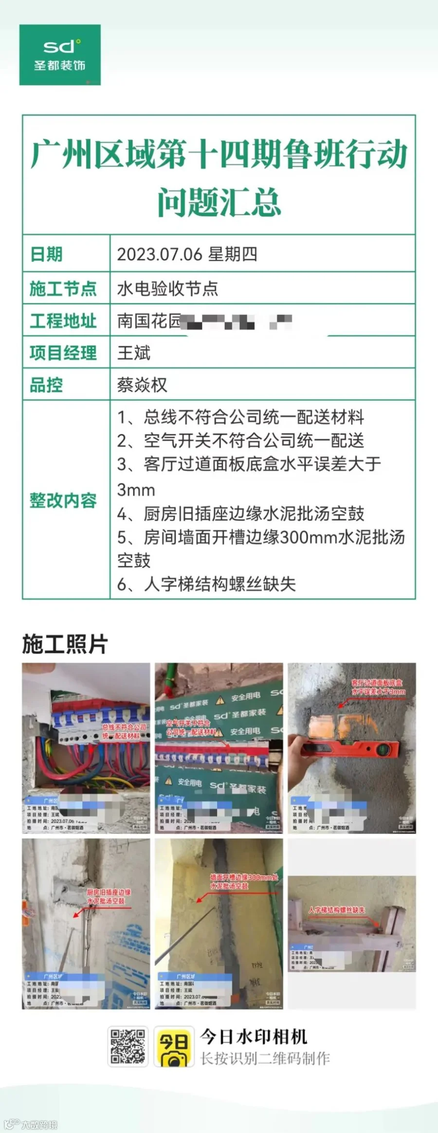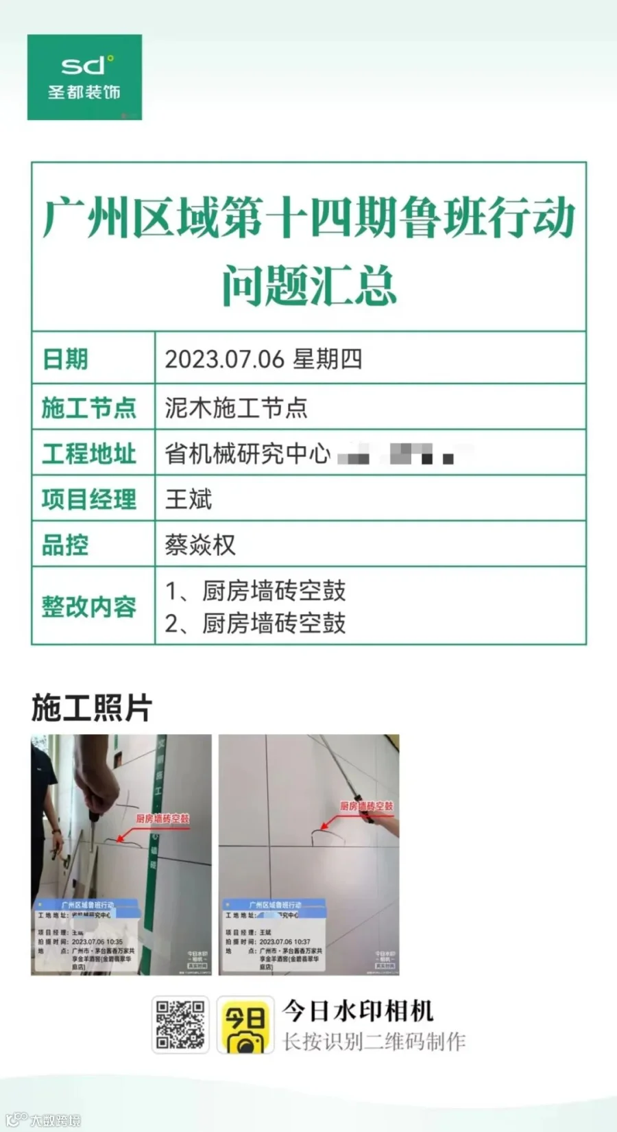 让工地巡查真正落到实处,让施工质量更安全,制度更完善,有问题立刻解决,不拖延,用更好的工艺、更好的服务来回报业主对我们的信任。鲁班行动,广州大区在行动!